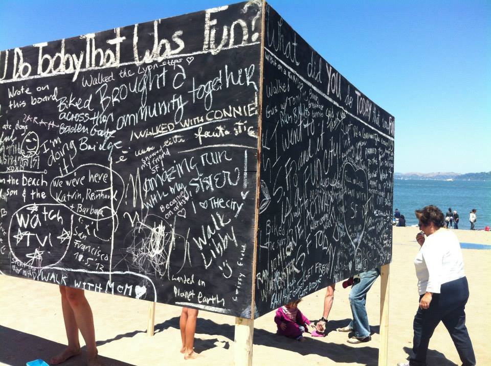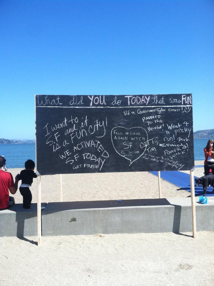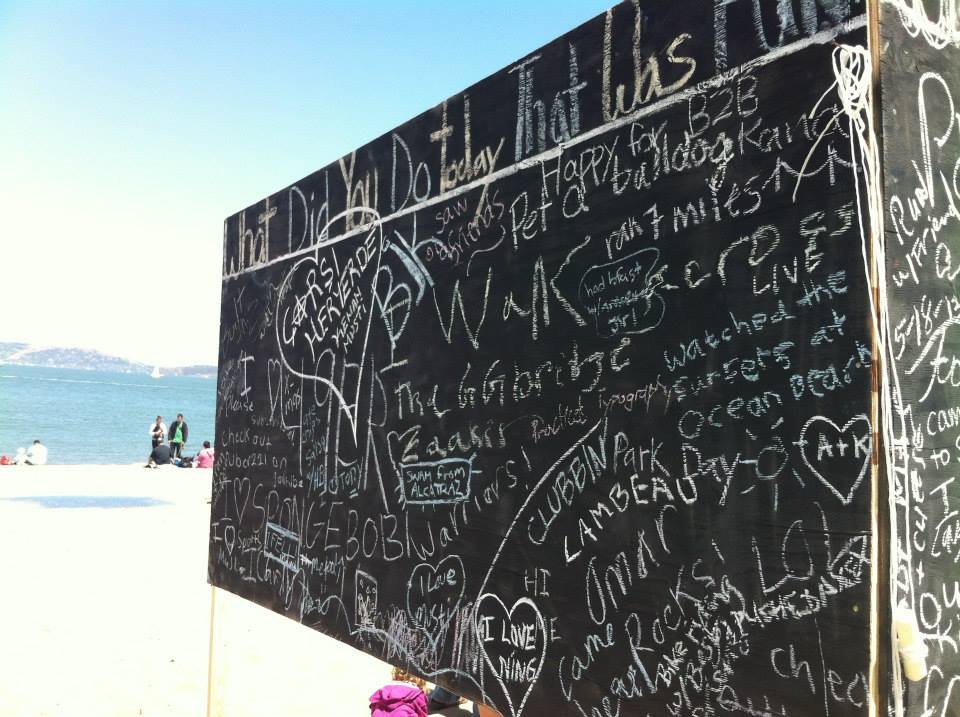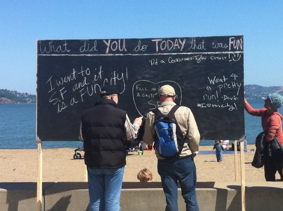Following the footsteps of the “before I die” wall in New Orleans, CommuniTyler San Francisco made public art spaces out of unused walls. Volunteers erected a board at a public beach that allowed passersby to answer the question “what did you do that was FUN today” in chalk. Within the first half hour, 50 people had written on the board! The volume and creativity of responses on the board, as evident in the slideshow above, is truly inspirational.